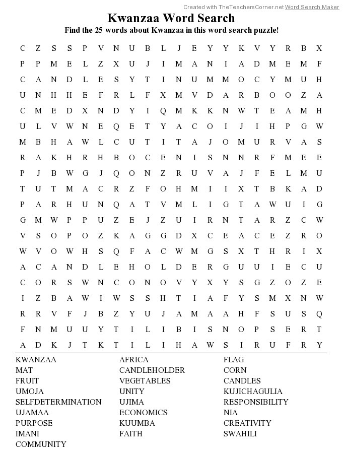 Kids can play a game of word search as they learn about these principles. Can you find all the words associated with kwanzaa? ١٢ جمادى الآخرة ١٤٤٠ هـ. African, american, candles, community, dancing, december, drum, faith, family, . Word search puzzles can be.